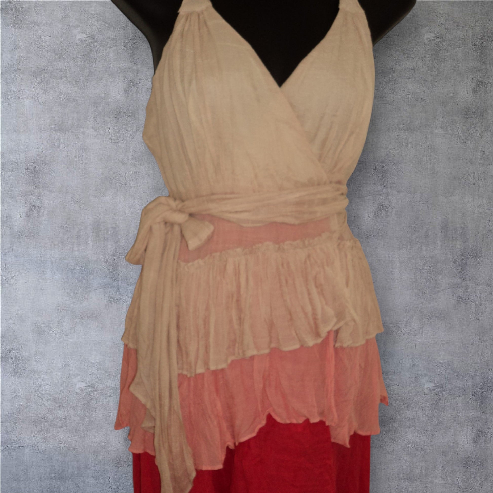 Gorgeous festival-style gauzy flowy dress featuring a wrap-around design with braided beaded straps. Designed in soft pink tones with a layered ruffled skirt, this lightweight sundress offers a relaxed, flattering silhouette. The wrap style allows for adjustable fit, making it suitable for a size Small and adjustable to Medium.