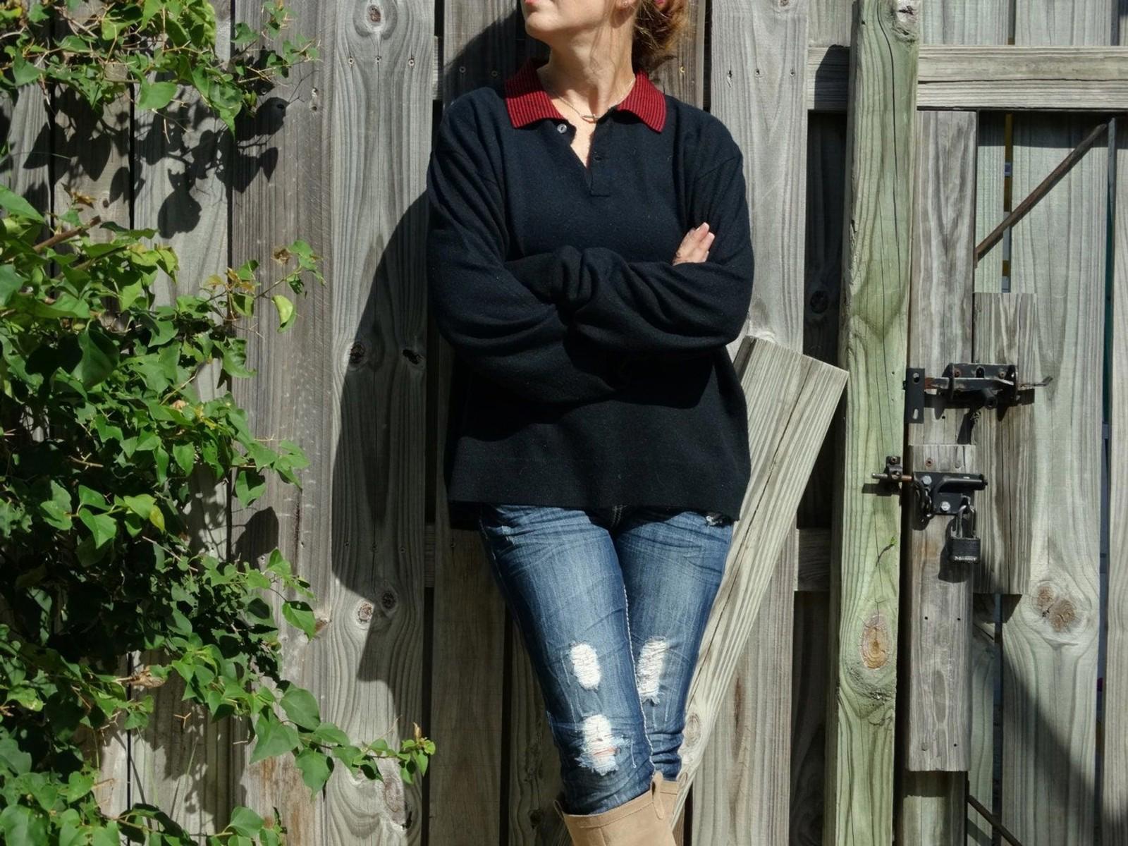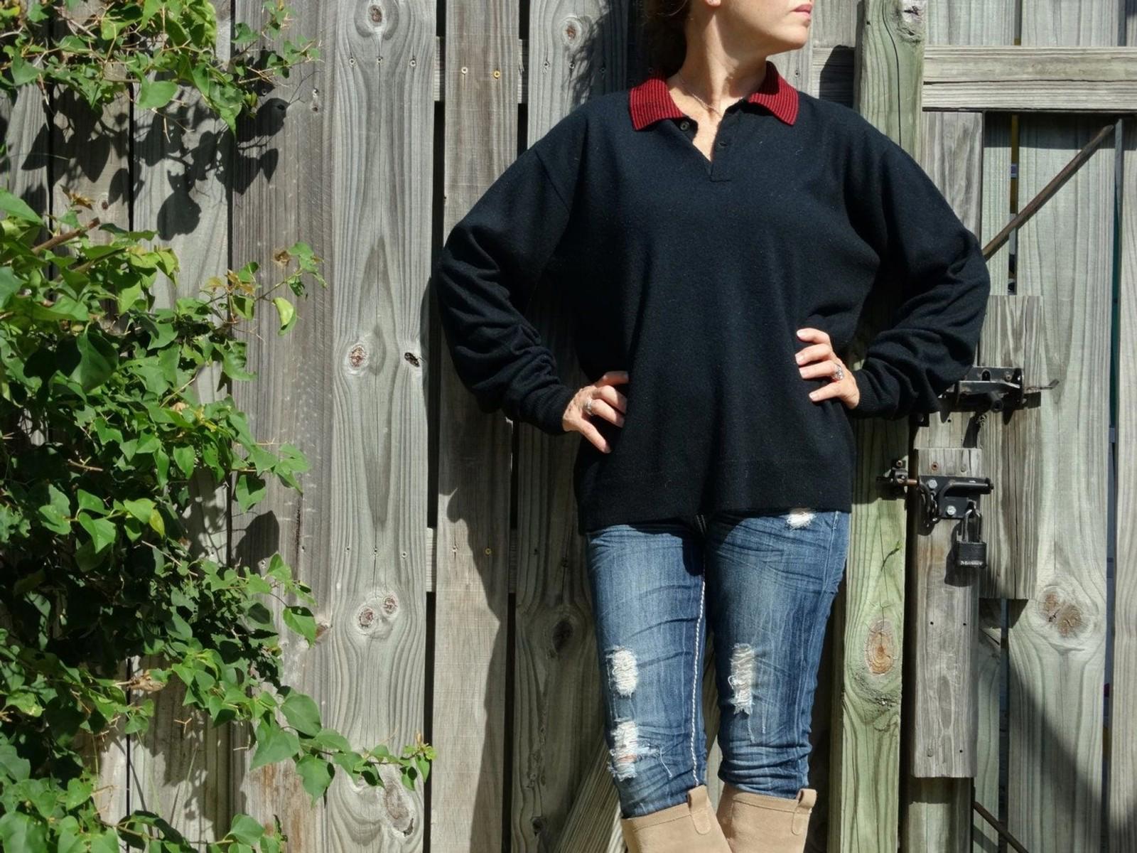 Classic vintage knit sweater by Glasgow Creation – Metropolitan Dayton, dating to the late 1960s–1970s. This timeless pullover features a rich black body contrasted by a bold red striped collar, giving it a relaxed collegiate and academia-inspired look. The soft, warm knit drapes beautifully with a naturally slouchy fit that works just as well styled casually with denim as it does layered for a vintage preppy aesthetic.