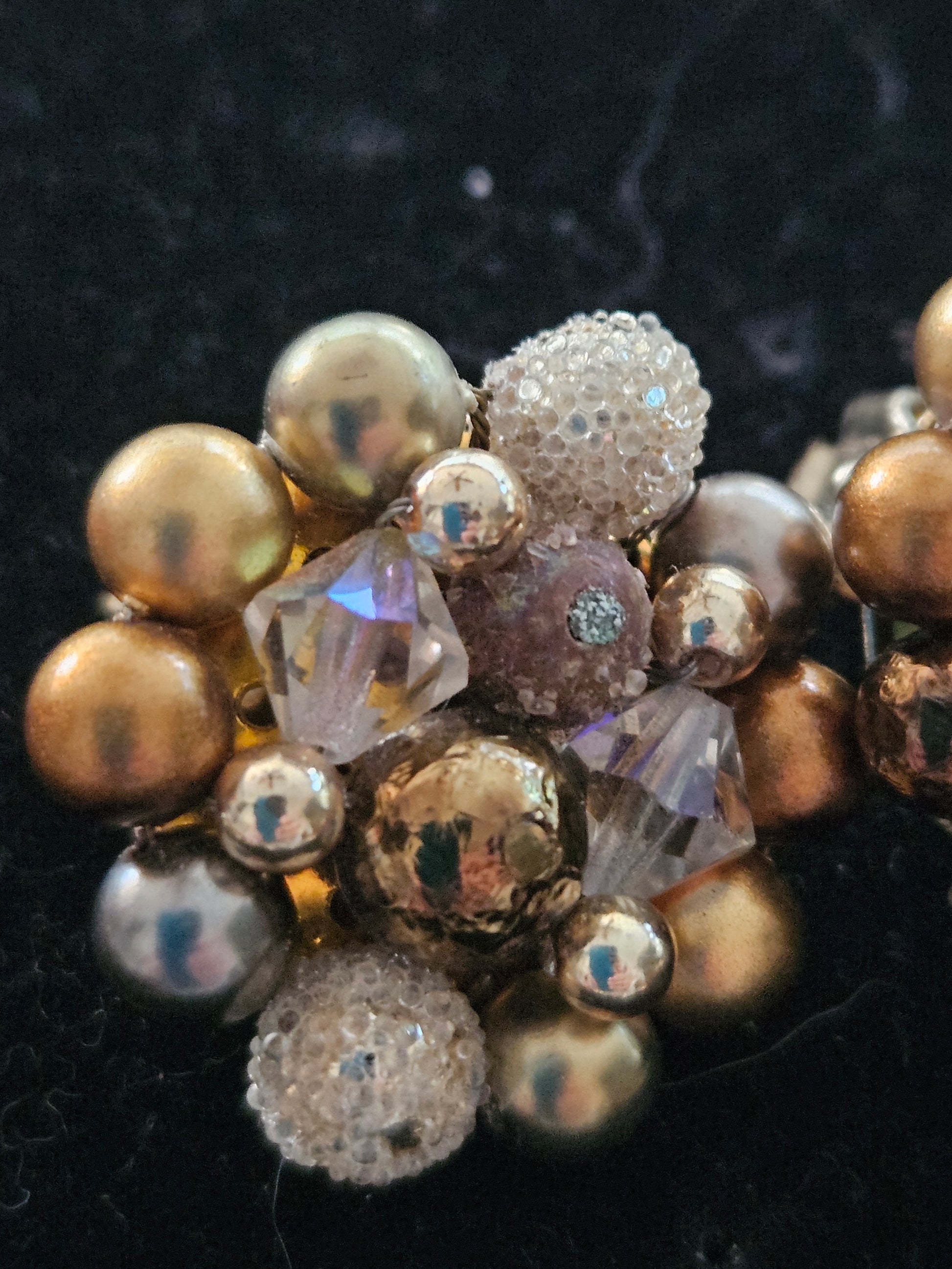 - Design: Dimensional cluster design featuring a mix of gold-tone and silver-tone beads, faceted crystal accents, and textured glitter beads arranged in a compact floral-style form. Rich metallic tones with subtle sparkle create classic mid-century glamour.