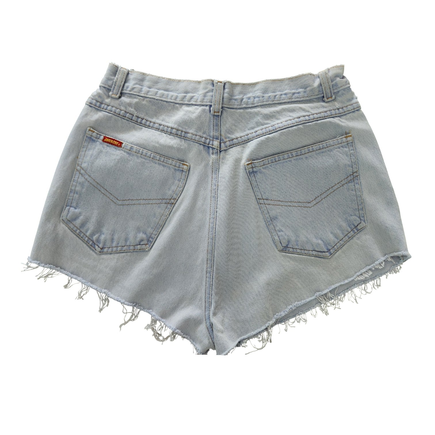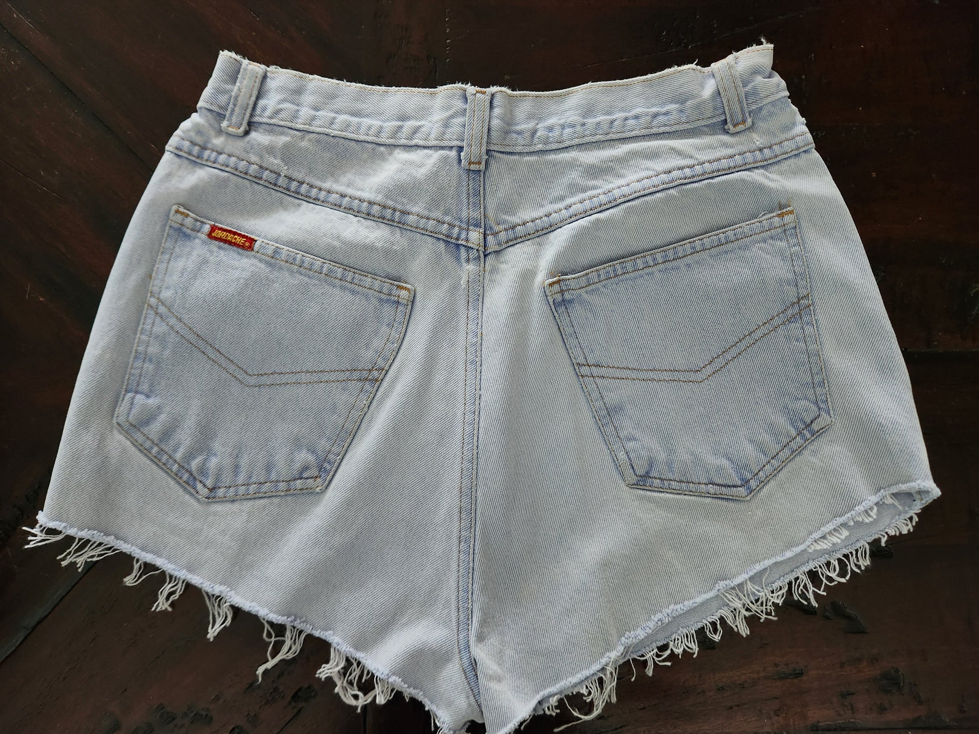 Vintage Jordache high-waisted distressed denim cut-off shorts in a light wash with frayed hems and subtle distressing. Classic 90s-inspired jean shorts with a flattering high-rise fit, perfect for summer outfits, casual wear, and festival style.