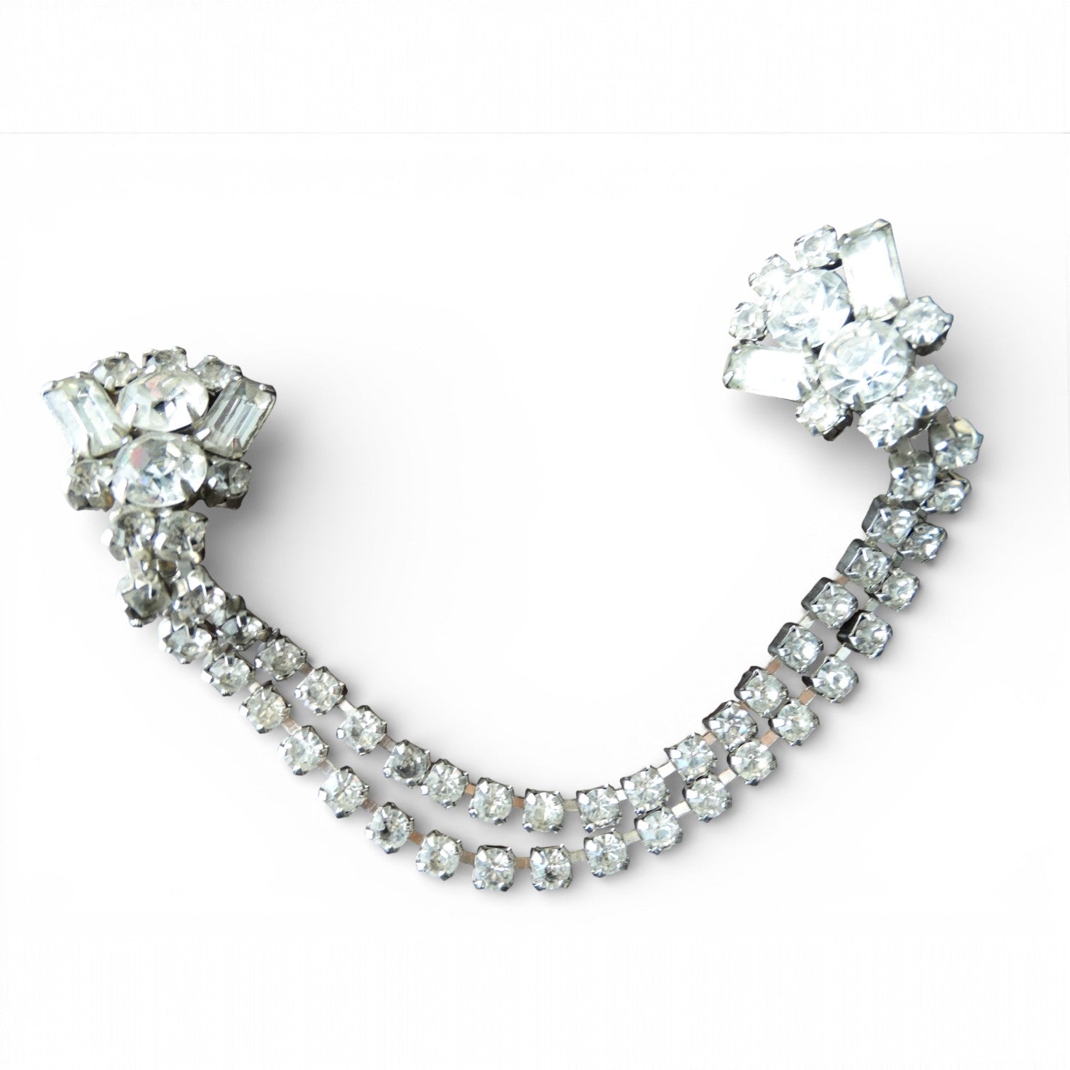 Vintage Mid-Century Rhinestone Sweater Guard | Double-Chain Silver-Tone Clip | 1950s–1960s