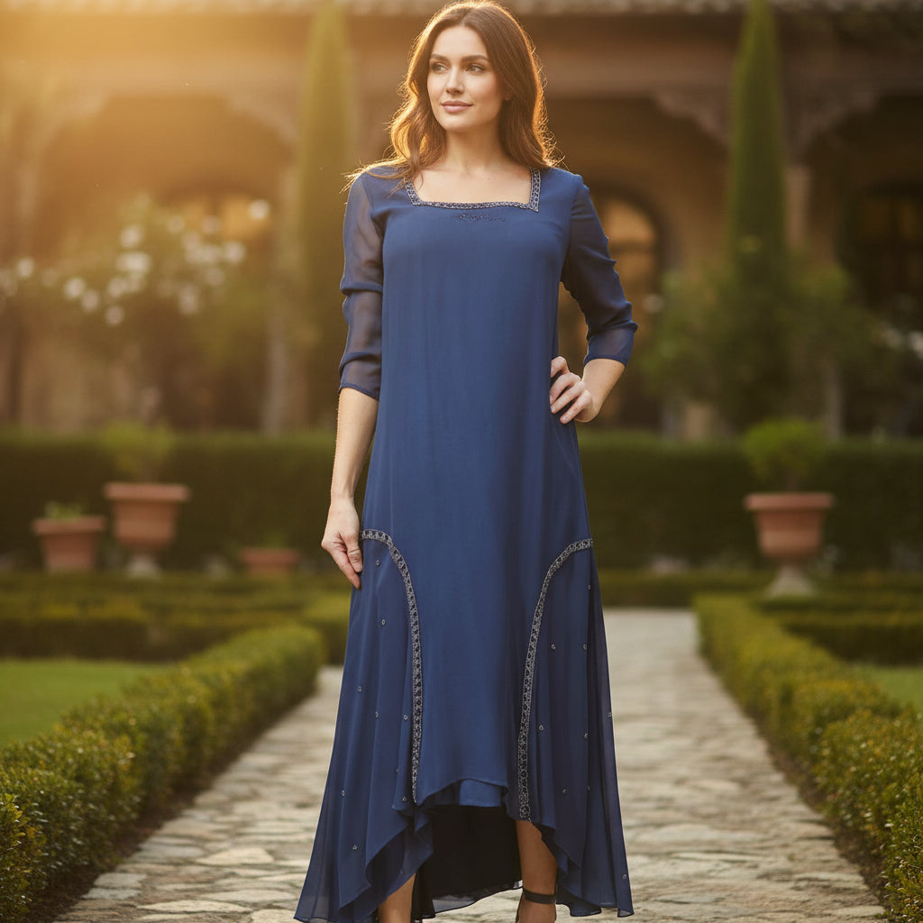 Beautiful vintage silk dress by Wednesday’s Child, showcasing a soft blue-grey tone with an elegant drape. This timeless piece features a square neckline accented with delicate beadwork, sheer sleeves, and a graceful hi-low hemline that moves beautifully with wear. Fully lined for comfort and coverage, this dress is ideal for evening events, special occasions, or understated formal looks.